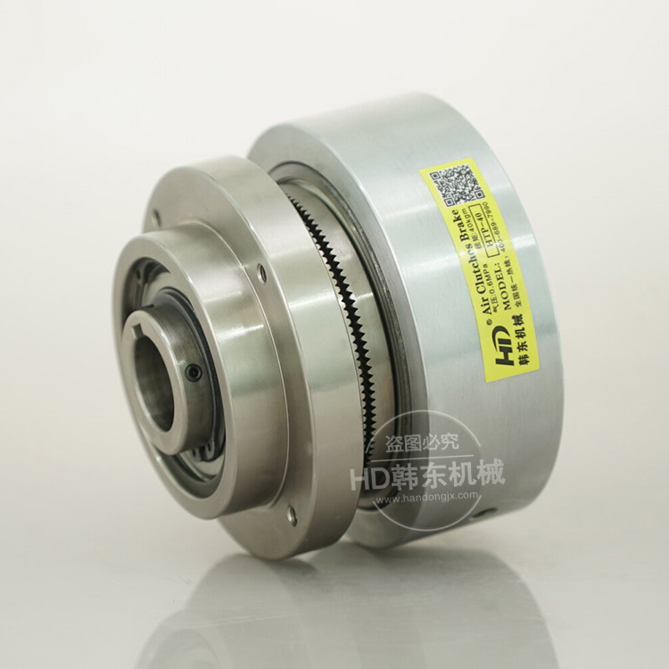 氣動(dòng)離合器HTP為韓東齒形離合器的一種,正常情況下驅(qū)動(dòng)圓盤隨著驅(qū)動(dòng)軸一起旋轉(zhuǎn),而傳動(dòng)圓盤不隨驅(qū)動(dòng)軸旋轉(zhuǎn)。當(dāng)電磁閥接通,氣體進(jìn)入氣缸時(shí),活塞推動(dòng)驅(qū)動(dòng)圓盤使傳動(dòng)圓盤與驅(qū)動(dòng)圓盤齒相嚙合,從而帶動(dòng)傳動(dòng)圓盤一起旋轉(zhuǎn),達(dá)到傳遞扭矩的作用。當(dāng)電磁閥斷開時(shí),復(fù)歸彈簧推動(dòng)氣缸,使其復(fù)歸原位,相嚙合的齒分開,從而達(dá)到離合的作用。