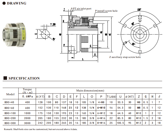 BDC model air multi-disc clutch is a compressed clutch, small size while transmit high torque. It is also called pneumatic multiple disc shaft clutch, multiple copper-based friction plates and steel disc engagement together by air pressure. No slippage, engagement tightly, integrated structure, easy installation, small size and large torque. Compared with tooth clutch, multiple air friction plate clutch is more suitable for high-speed integration and high-speed rotating. HD company manufactured BDC model air multiple friction plates clutch is widely applied in industry automation, packing and printing machinery, engineering sanitation vehicle, water pump fan and etc. Our clutches have gained good reputation in the market by our customers.