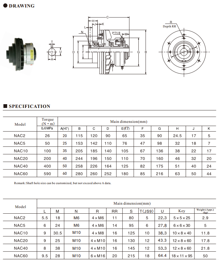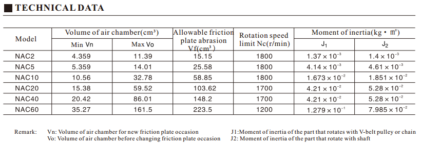 NAC model air shaft clutch is linked with air pressure, released by return springs. Disc relies on air pressure to slide along the direction of the axis, contacting the friction plate. Disc, friction plate and so on, are assembling to the wheel to come into an integrated structure.