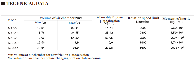 NAB model brake relies on air pressure to brake, return springs to release. After supplying air pressure, piston pushes piston aircraft and friction plate move towards to and compressed shaft attached lining disc, disc and other rotating parts stopped, brake braked. After exhausting air pressure, piston aircraft and friction plate are separated with shaft attached lining disc by return springs, brak released. It reduced heat generated from friction by cooling plate mounted on disc with hub. Friction plate is two-cut style, using screwdriver to take out head inside screw through hole of disc with hub, in order to replace friction plate.
